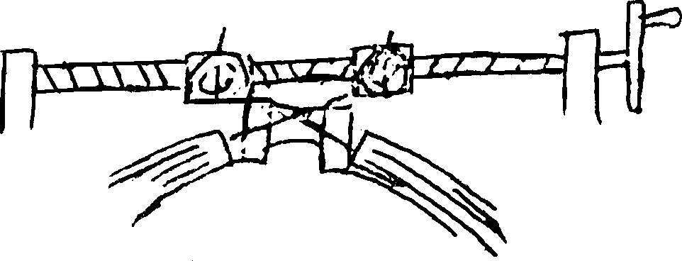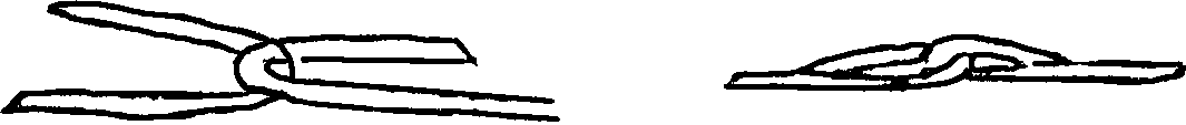 Make certain that the wire knots in your tire are formed as sketched above. The knot must be folded tight and well soldered for safety. After soldering, file the rough edges from the knot, so it will slip through the tire without causing the joint in the tire to expand. The trouble with this joint is you get a thump each rotation and the rubber wears at this point more than the rest of the tire. Note: Also consult Bulletin #25 for another method of tiring and a new machine.